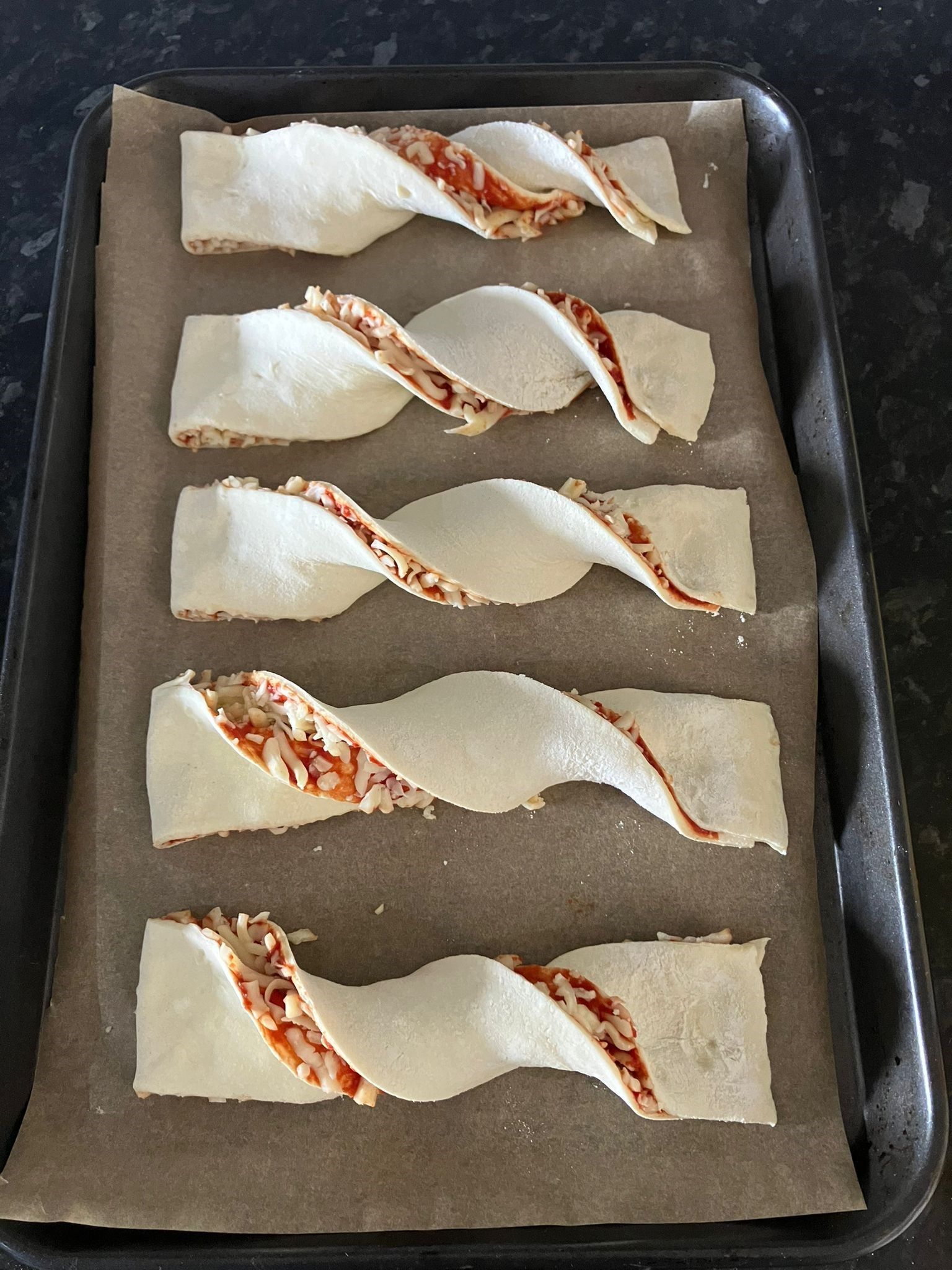 - Once twisted, place on a baking tray lined with greaseproof paper.