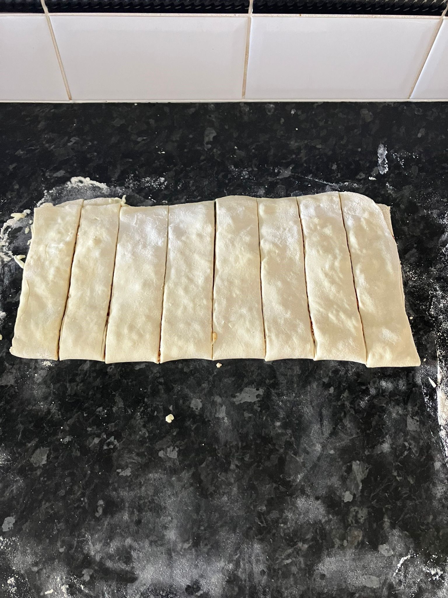 - Using a sharp knife, cut the pastry lengthways creating 8 even long rectangles