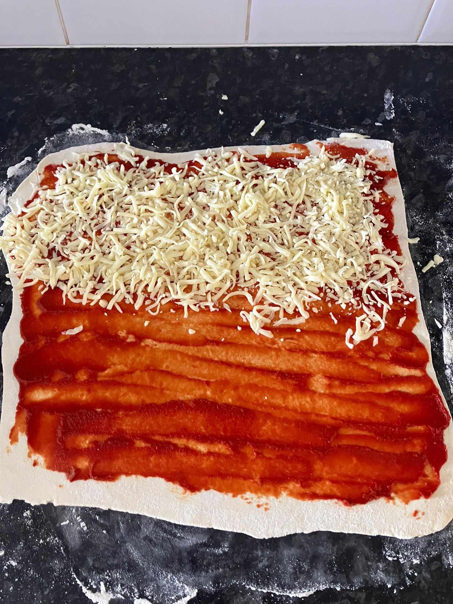 - If using fillings such as tomatoes/pepperoni, lay these in line across the pastry in rows of 8.